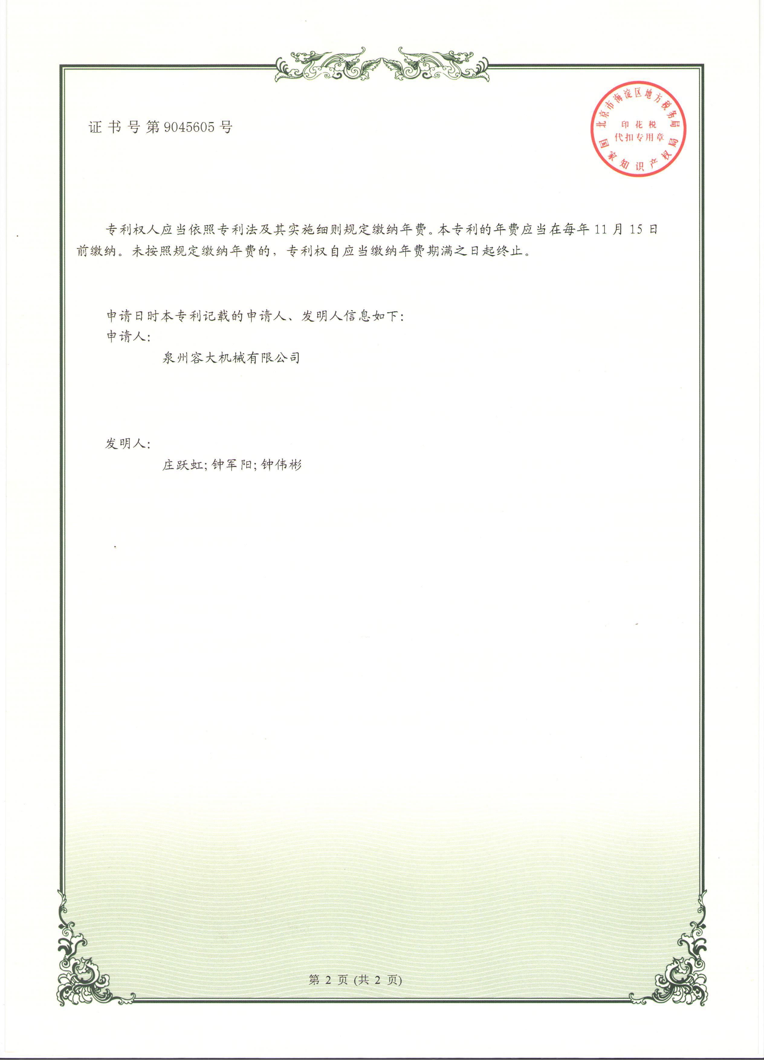 您的位置: 泉州容大機(jī)械有限公司 > 專利證書 > 管道管托